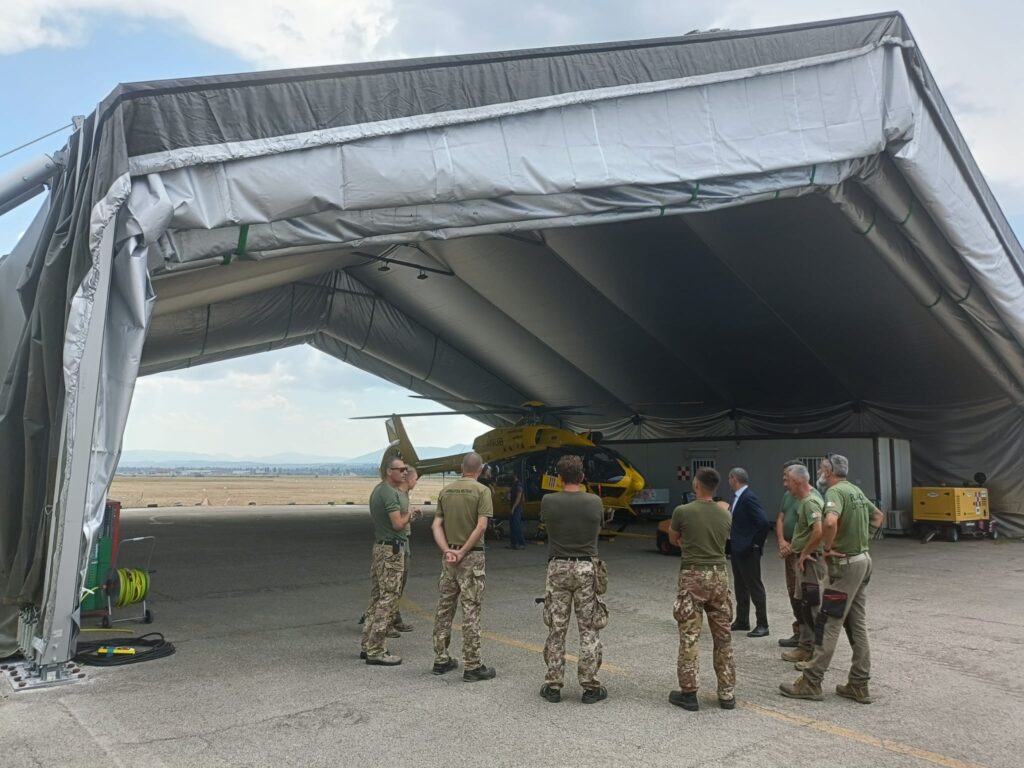 Un hangar provvisorio per Nibbio. È quello installato all’aeroporto di Foligno in attesa che venga realizzato quello definitiva per la rimessa dell’elicottero impiegato nelle operazioni di elisoccorso. Ad occuparsi dell’installazione, avvenuta in soli 12 giorni, è stato un team di personale tecnico proveniente dal terzo Stormo di Villafranca, reparto del Comando logistico dell’Aeronautica militare specializzato nella logistica di proiezione. Così facendo si potrà garantire all’elicottero protezione dalle intemperie e dall’irraggiamento solare.