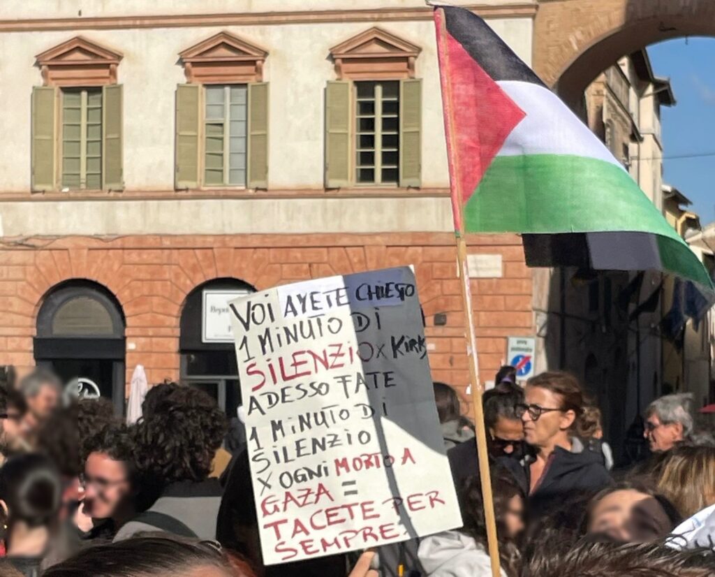 “Voglio ringraziarvi – ha detto poi una giovane – perché stiamo abbattendo il male sistemico tramite azioni non violente organizzate, le parole libere di amore si stanno facendo strada. È inutile sprecare un minuto di silenzio per un singolo individuo prepotente, quando il silenzio per tutti i bambini palestinesi varrebbe molto di più. Viva l’umanità senza confini”.